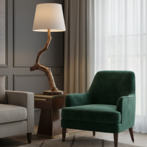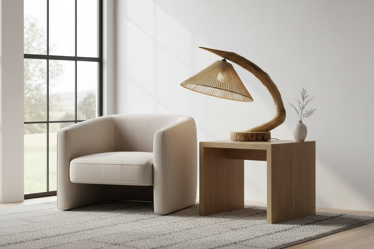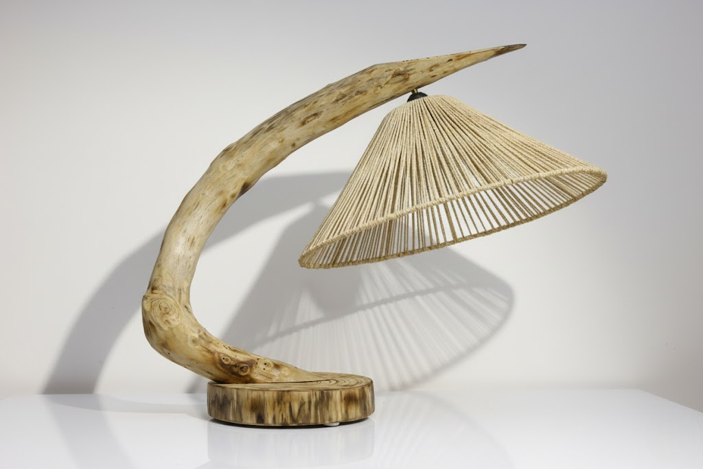 Ravnoteža dizajna: Drveni krak elegantno visi nad postoljem, stvarajući osjećaj lebdenja i vizualne lakoće.